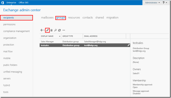 1.進入Exchange系統管理中心>收件者>群組>點選群組編輯。