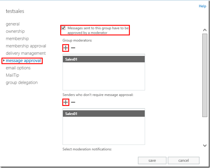 2.點選訊息核准>勾選傳送至此群組的郵件必須經過仲裁者的核准,然後新增仲裁者以及不需核准的寄件者。