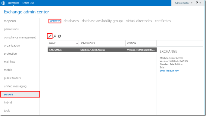 1.進入Exchange系統管理中心>伺服器>伺服器>點選信箱伺服器編輯。