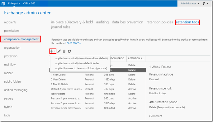1.進入Exchange系統管理中心>相符性管理>保留標記>+(新增),選擇類型,輸入標記名稱和選擇動作。