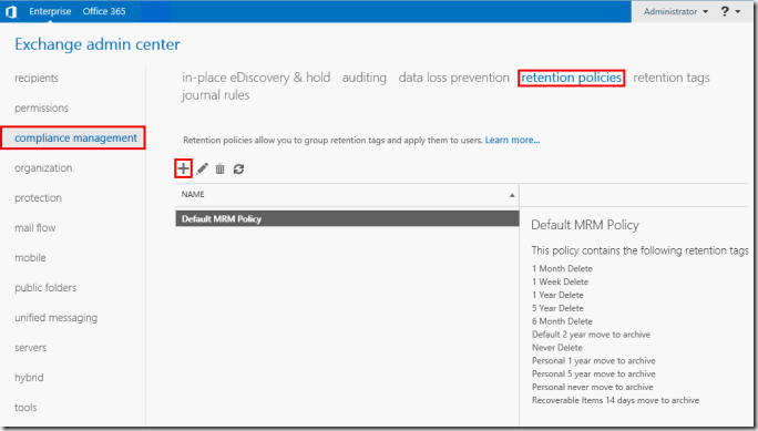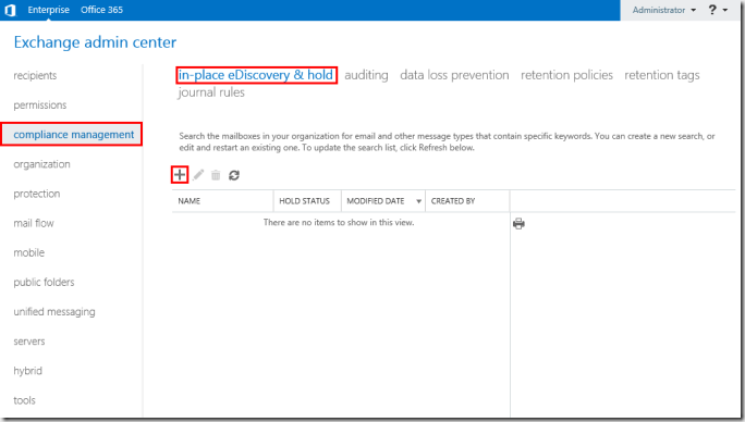 3.進入Exchange系統管理中心>相符性管理>就地e-Discovery和保留>+(新增)。