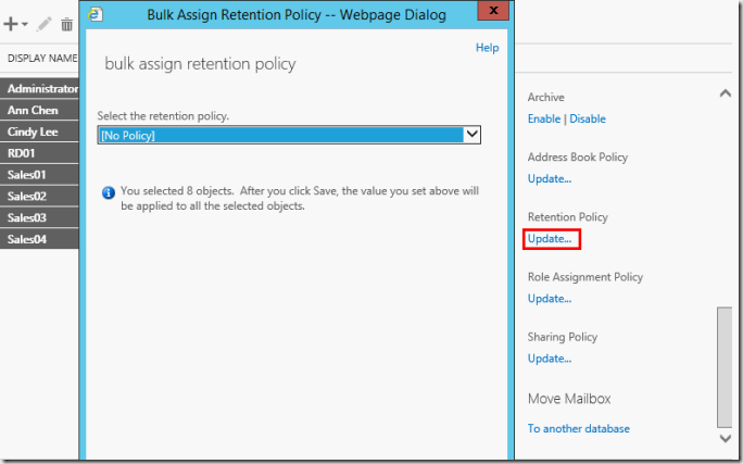 3.大量選擇使用者後,選擇右方窗格中的更新保留原則。