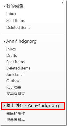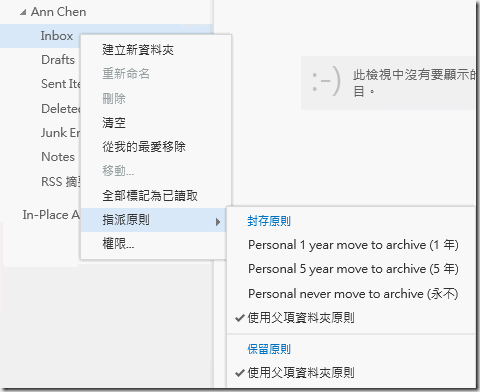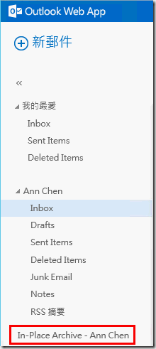 5.OWA和Outlook中會顯示封存信箱,使用者可直接將信移動到封存信箱中,或是使用指派封存原則的方式將信移動到封存信箱。