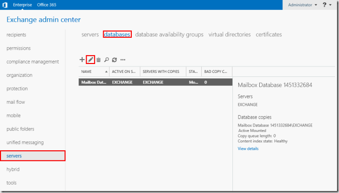 1.進入Exchange系統管理中心>伺服器>資料庫,點選資料庫>編輯。