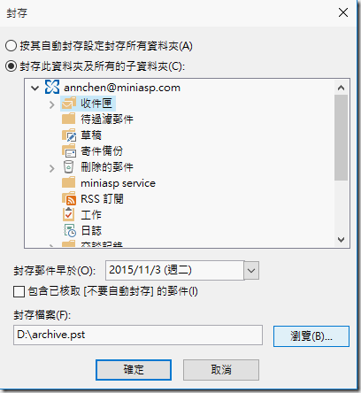 2.選擇要封存的資料夾,就能在本機中匯出PST檔做備份。