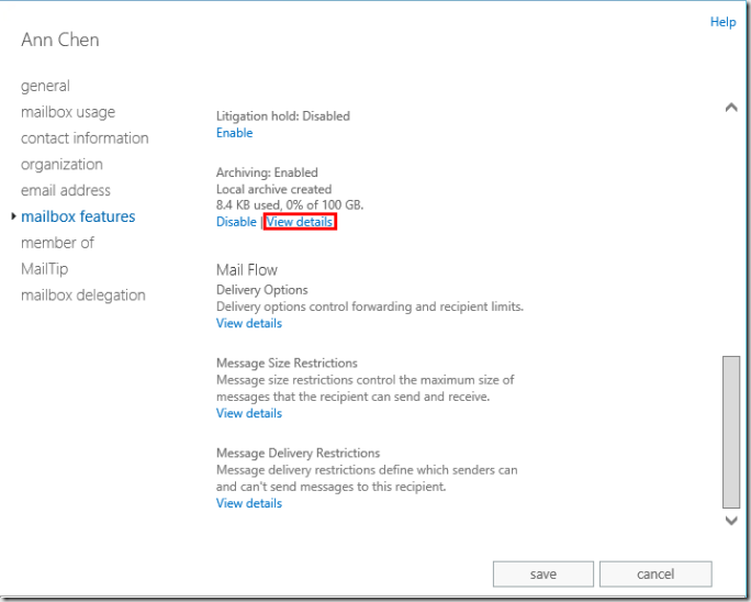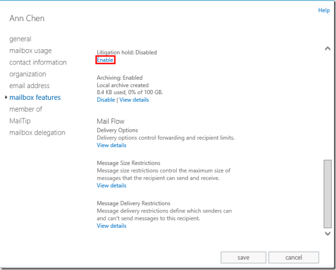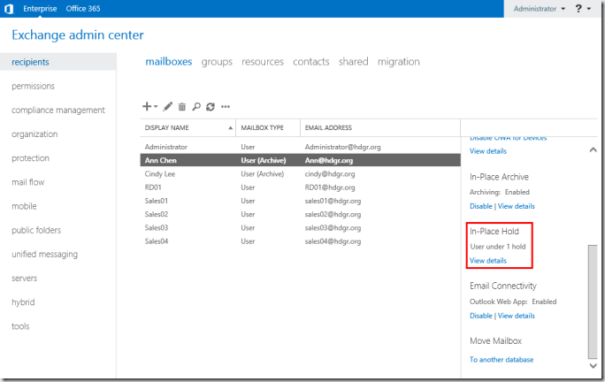 10.回到收件者>信箱>點選使用者,可以在右邊窗格中看到使用者就地保留狀態。