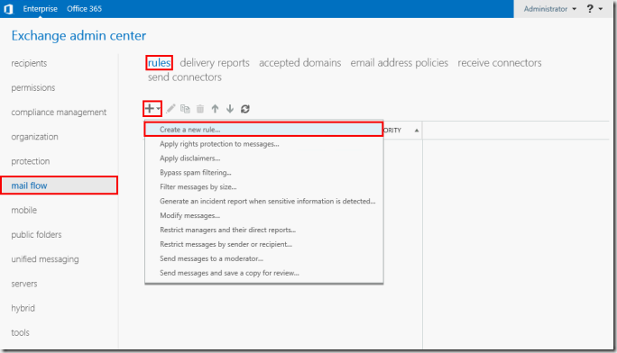 1.進入Exchange系統管理中心>郵件流程>規則>+(新增)>建立新的規則。