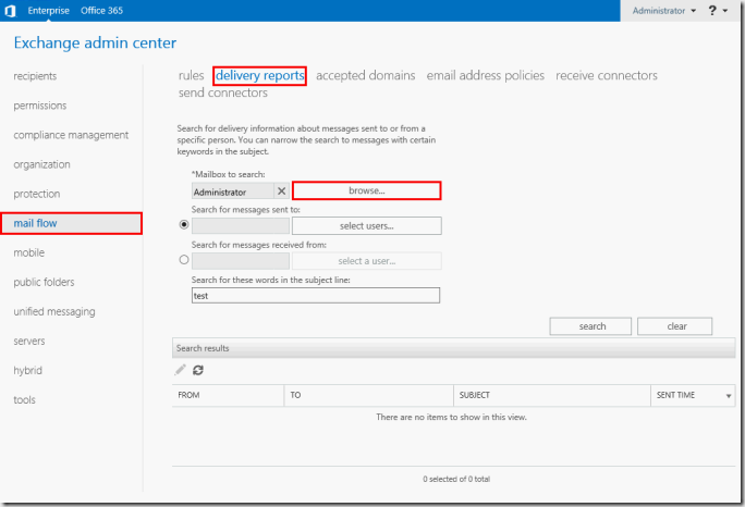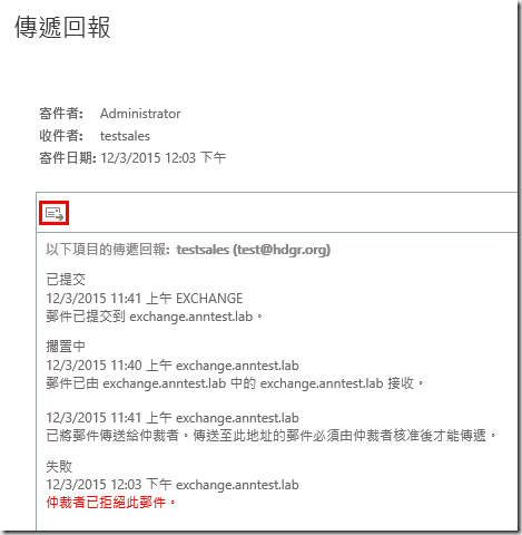 1.進入Exchange系統管理中心>郵件流程>傳遞回報,選擇欲追蹤郵件所在的信箱,另外可以指定寄件者、收件者或標題中的關鍵字。