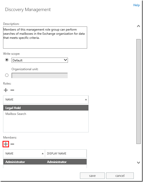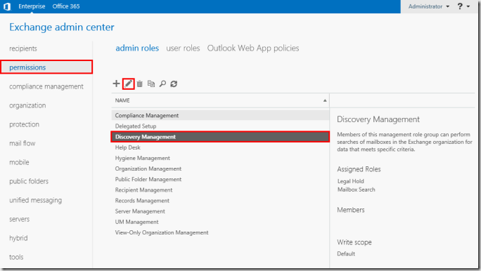1.進入Exchange系統管理中心>權限,點選Discovery Management>編輯。