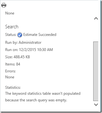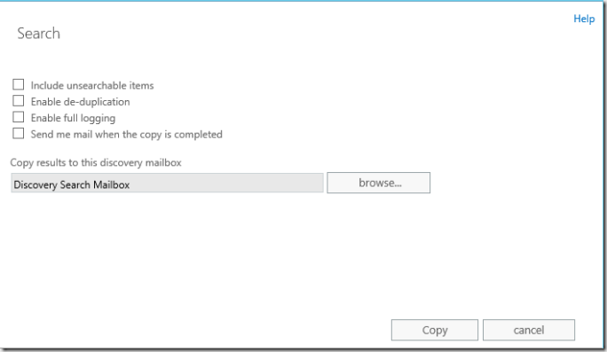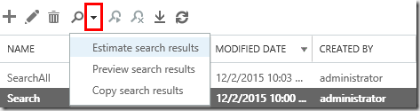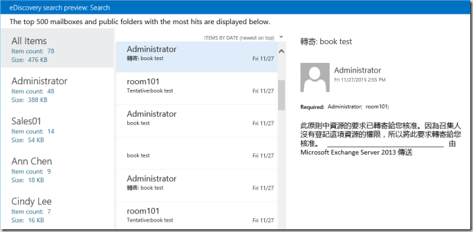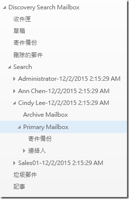 複製搜尋結果:搜尋的範圍為全部信箱時無法啟用就地保留,透過複製搜尋結果的選項,可以將搜尋出來的郵件複製到探索信箱內。(有啟動就地保留的搜尋結果會自動放在探索信箱內)