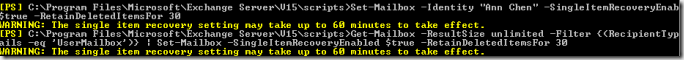 Set-Mailbox -Identity "使用者名稱" -SingleItemRecoveryEnabled $true -RetainDeletedItemsFor 30