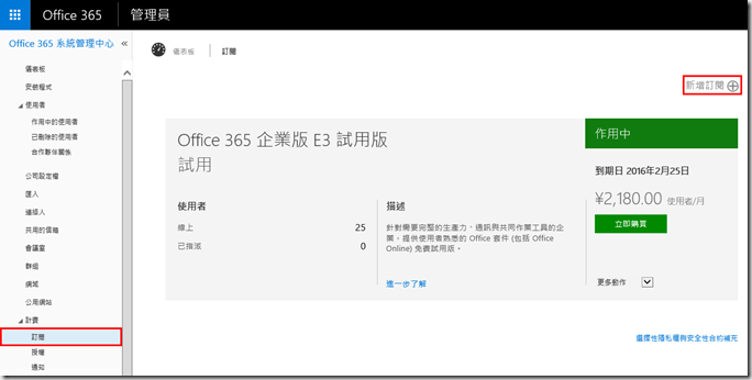 1.進入Office365系統管理中心>計費>訂閱>新增訂閱。