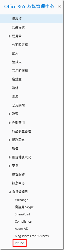1.以IE進入Office365系統管理中心,點選系統管理員下的Intune。