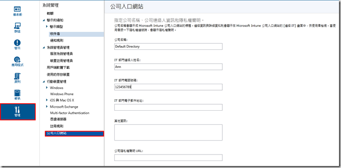 1.點選管理>公司入口網站,在此可設定IT人員的聯絡方式。