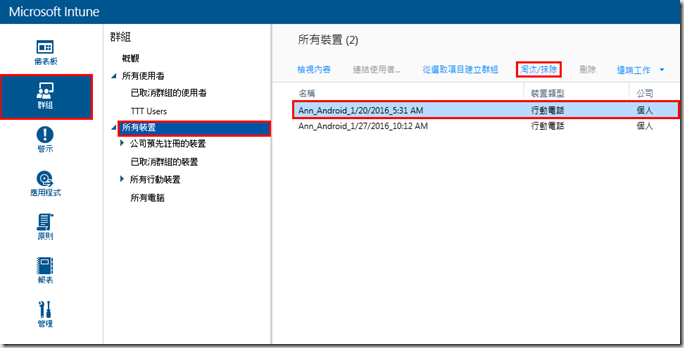 1.進入Microsoft Intune管理介面,點選群組>所有裝置>手機名稱>淘汰/抹除。