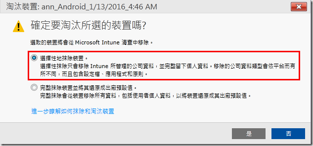 2.選擇性抹除只會移除本來受Intune管理範圍的資料,若使用者希望連個人資料也抹除,才選擇完整性抹除將手機能還原成出廠預設值。