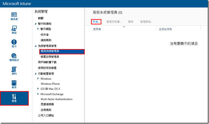 1.進入Microsoft Intune管理介面,點選管理>系統管理員管理>服務系統管理員>新增。