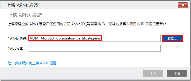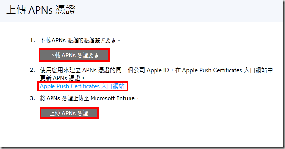 5.回到Intune管理頁面,點選上傳APNs憑證,上傳剛剛下載的pem檔。
