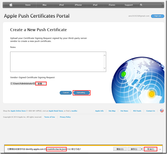 3.將剛剛下載的憑證要求檔上傳,跳出開啟或儲存.json結尾的檔案選擇取消。