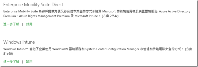 2.找到EMS(當中包含Microsoft Intune)或Windows Intune(此為舊版名稱,現已改為Microsoft Intune但訂閱中的名稱還未改)點選試用。