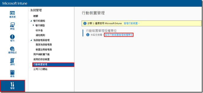 2.點選管理>行動裝置管理>設定行動裝置管理授權單位。