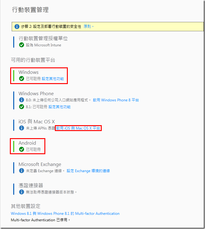 3.啟動行動裝置管理後,Windows系統和Android就可以立即註冊了,而若要讓iOS的手機能夠註冊,需點選啟用iOS與Mac OS X平台開始設定。