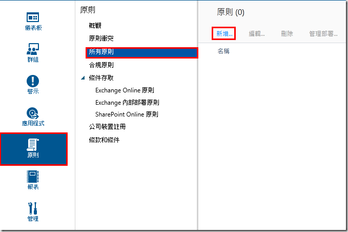 1.進入Microsoft Intune管理介面,點選原則>所有原則>新增。