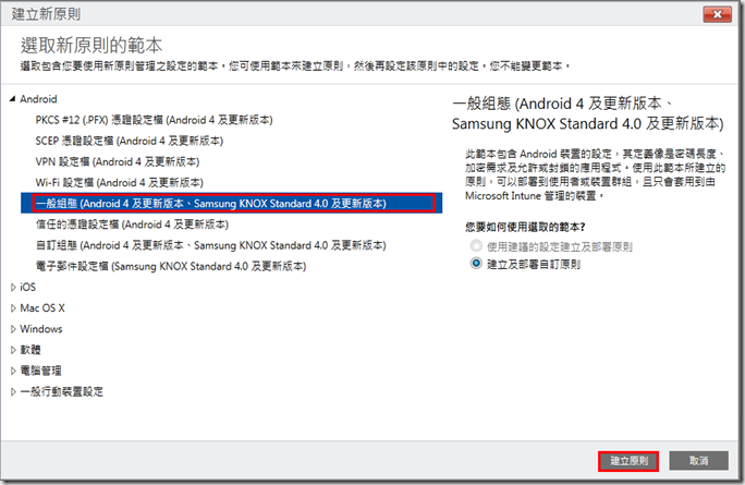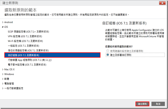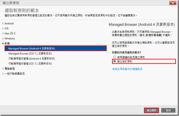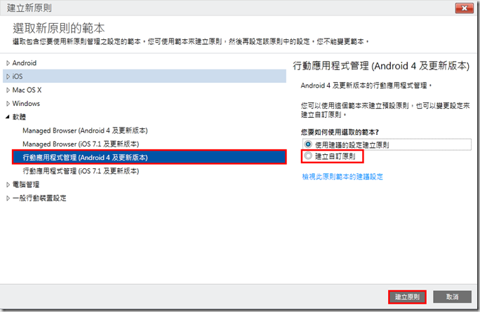 或是行動應用程式管理,建議選擇建立自訂原則,選擇使用建議的設定建立原則的話就直接建立完成了,想要更改還要多一步驟再去編輯。