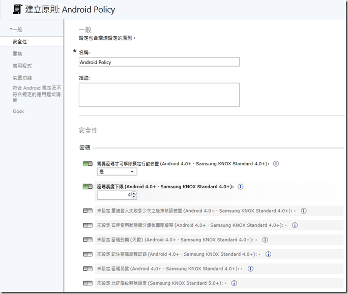 2.輸入原則名稱後,依照需求設定。本例中啟動不可破解或刷機。之後部署給所有使用者。