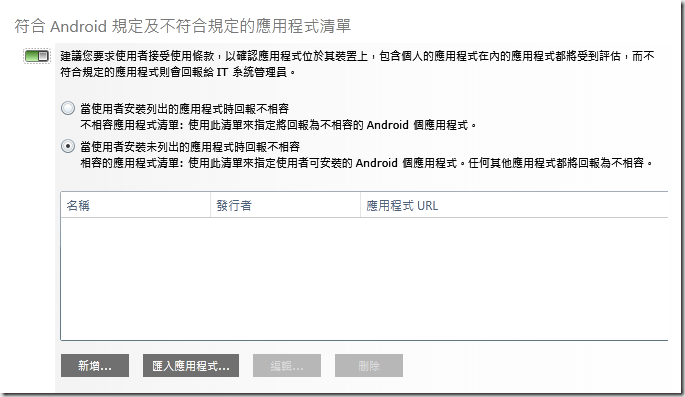 6.雖然一般組態中,都是設定強制裝置符合原則,但其中有一個部分例外,那就是下圖中設定不符合規定的應用程式清單的部分。