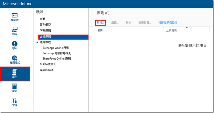 1.進入Microsoft Intune管理介面,點選原則>合規原則>新增。