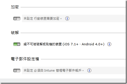 合規原則:不會強制要求裝置符合原則,配合條件存取原則,若不符合將無法進行某些存取動作。例如合規原則中禁止JB或Root,有JB或Root過的裝置就無法存取Exchange Online的信件。