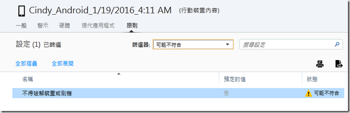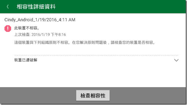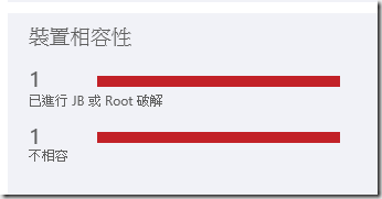 3.若有不符合規定的裝置存在,在群組的概觀中裝置相容性顯示有一個不相容,原因為已進行JB或Root破解。