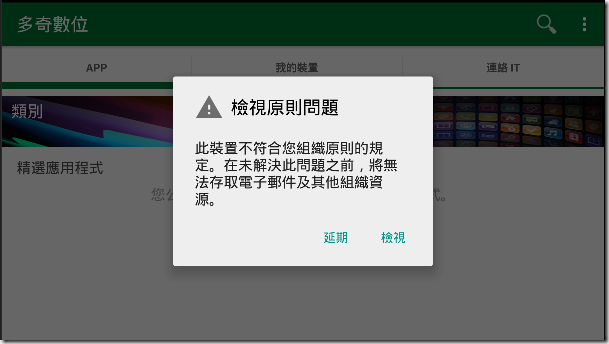 5.在應用程式部署時套用設定的原則後(請參考Microsoft Intune (05) 如何提供或強制使用者安裝APP?此篇文章)。使用者一進入受管理的應用程式中,便會顯示由您的公司管理,並強制要求設定PIN碼。