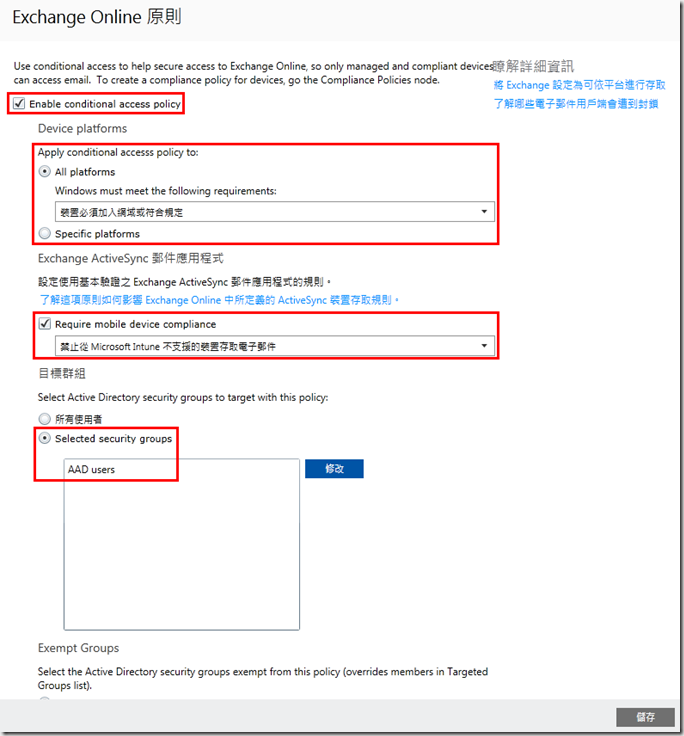 1.如果Office365中已經有Exchange Online和SharePoint Online的授權,不需要再進行其他設定,但若是Exchange內部部屬,就要先設定Exchange Connector。本例為設定Exchange Online,不符合規定的裝置無法存取Exchange Online的資料(加入網域為電腦的設定),部署對象為某安全性群組。