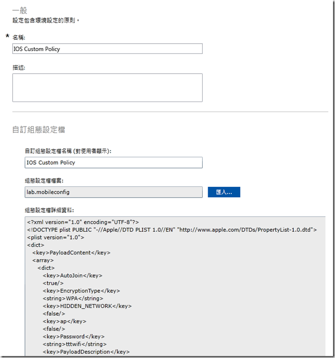 自訂組態原則:強制裝置符合原則,無範本,需自行用XML編寫組態設定檔匯入。