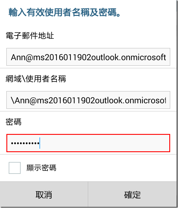 5.由於管理員在設定檔中已經決定用登入公司入口網站的使用者帳號當電子郵件地址,使用者只需要輸入密碼即可設定完畢。