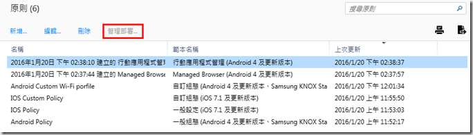 軟體原則:對可受管理的App設定原則,例如。可受管理的應用程式如Managed Browser和[Office 365 快速上手系列] 隨時都可在手機上使用Office365這篇文章中所介紹的App。