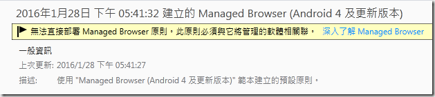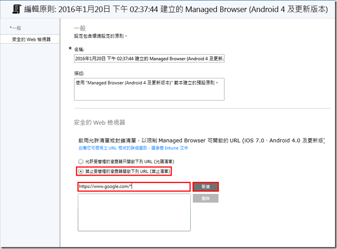 2.輸入原則名稱後,依照需求設定。本例中設定Managed Browser禁止連入Google開頭的網頁。行動應用程式管理則是依照建議的設定。