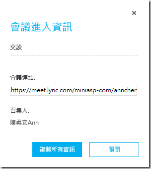 2.選擇複製所有資訊後,將連結貼給欲要邀請的對象,對方將會透過Web版Skype For Business加入會議。