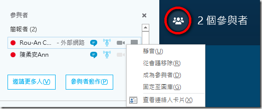 1.點選圖中紅圈的地方,開啟參與者清單。對著名字點右鍵可以看到對單一參與者的管理選項。