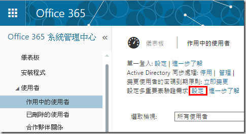 1.進入Office365系統管理中心>使用者>作用中的使用者,點選多重要素驗證的設定。