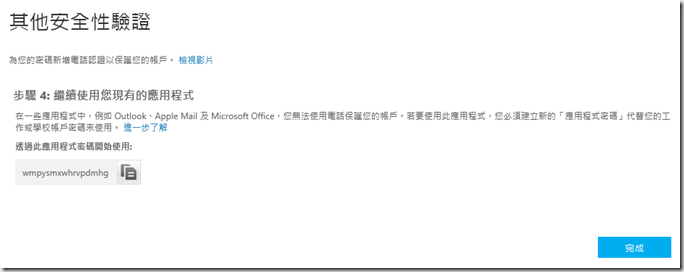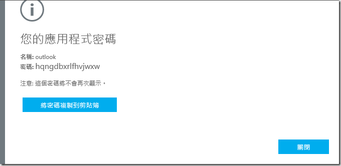 11.請注意,所有的應用程式密碼都無法再查詢到,若是忘記了只能再建立新的,所以在應用程式設定完成前,請保存好這組密碼。