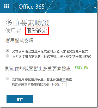 3.回到多重要素驗證頁面,點選服務設定,在這裡可以禁止使用者建立應用程式密碼、允許使用者暫時停止多重要素驗證。
