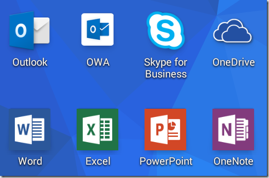 官方在手機上出了很多App,無論是Iphone還是Android都有,讓您即使不方便使用電腦,也還是可以連線到Office365進行作業。如下圖所示,有收信用的Microsoft Outlook或OWA for Android(or IOS),即時通訊和線上會議用的Skype fo Business,1TB雲端空間OneDrive和Office手機版應有盡有。