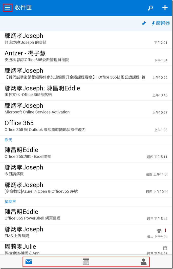左上角一樣是進入資料夾,下方從左到右為郵件、行事曆、連絡人,相比Outlook沒有附件檔案。