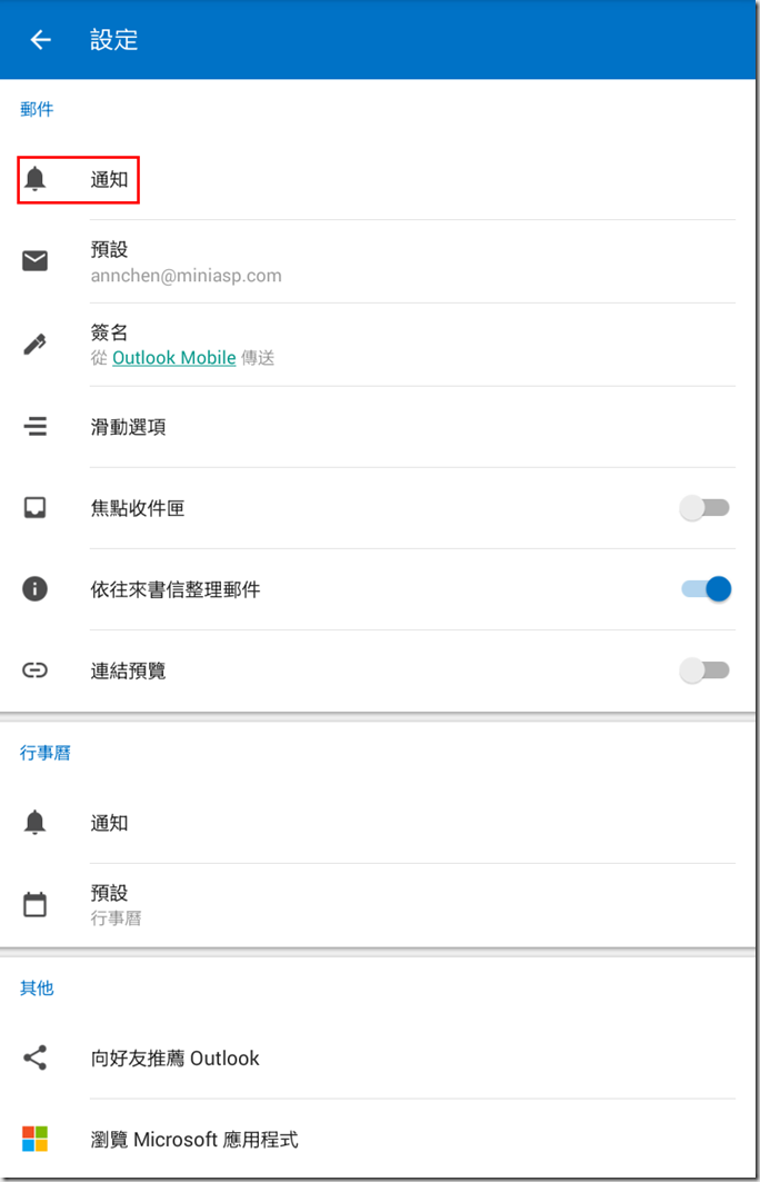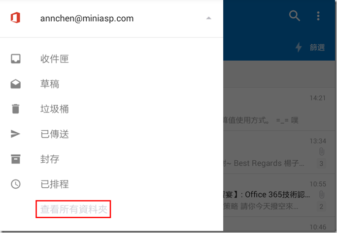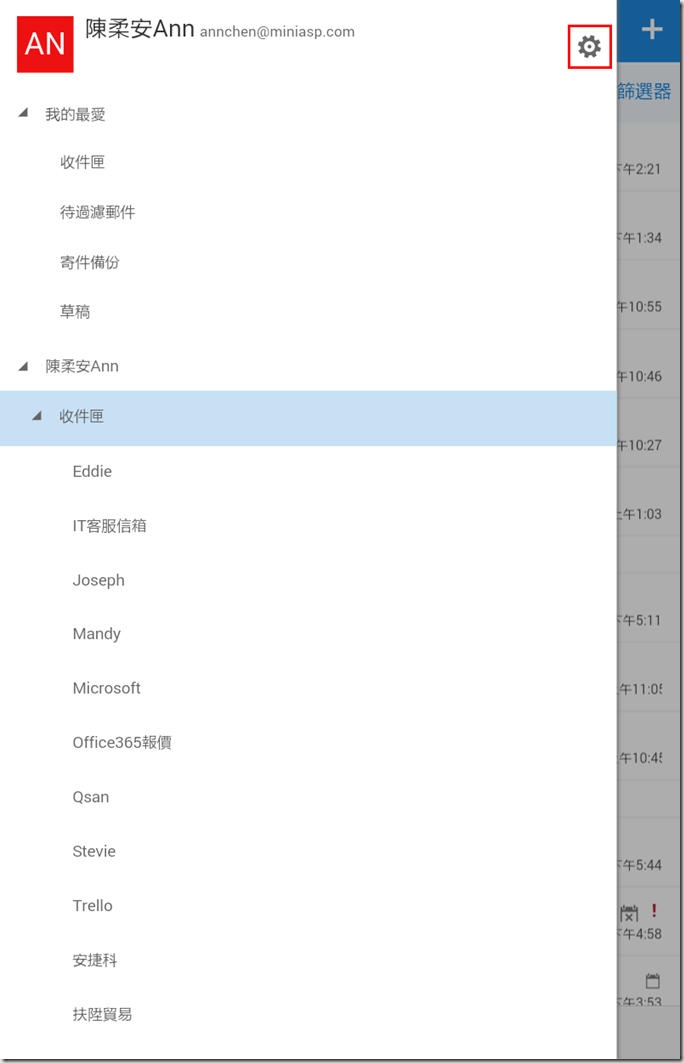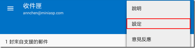 3.這裡教大家一個常用的設定,常用手機收信的人一定都希望收到信後就有通知,但是預設的通知卻只會通知收件匣的信,如果信件有設規則分類到其它資料夾就沒有通知了。要調整這個設定,請點選右上角…>設定。