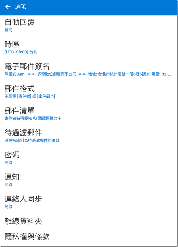 3.點選齒輪圖案,可以設定自動回覆和App密碼鎖等是Outlook App沒有的。