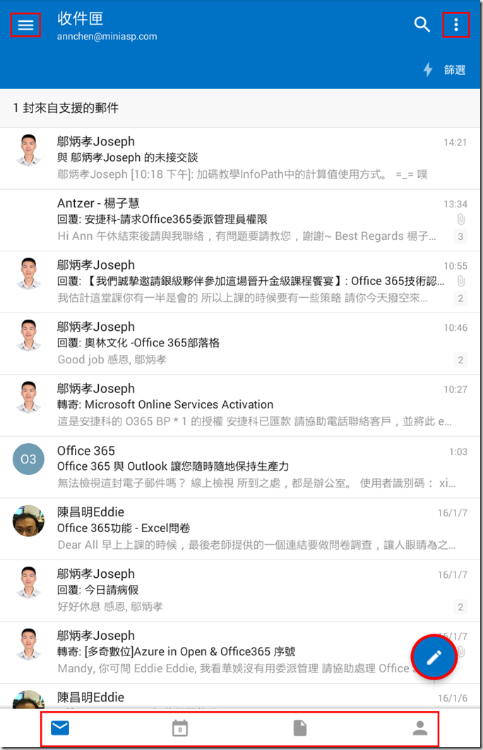 1.左上角可列出資料夾,右上角為設定,右下角圓圈為新增郵件,下方從左到右為郵件、行事曆、檔案(附件檔案)和連絡人。