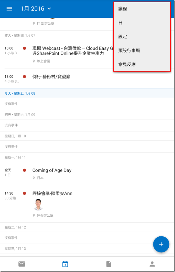 6.在下方點選行事曆後,右上方的設定會改變選項,預設是用議程的方式檢視,可以切換為日檢視。